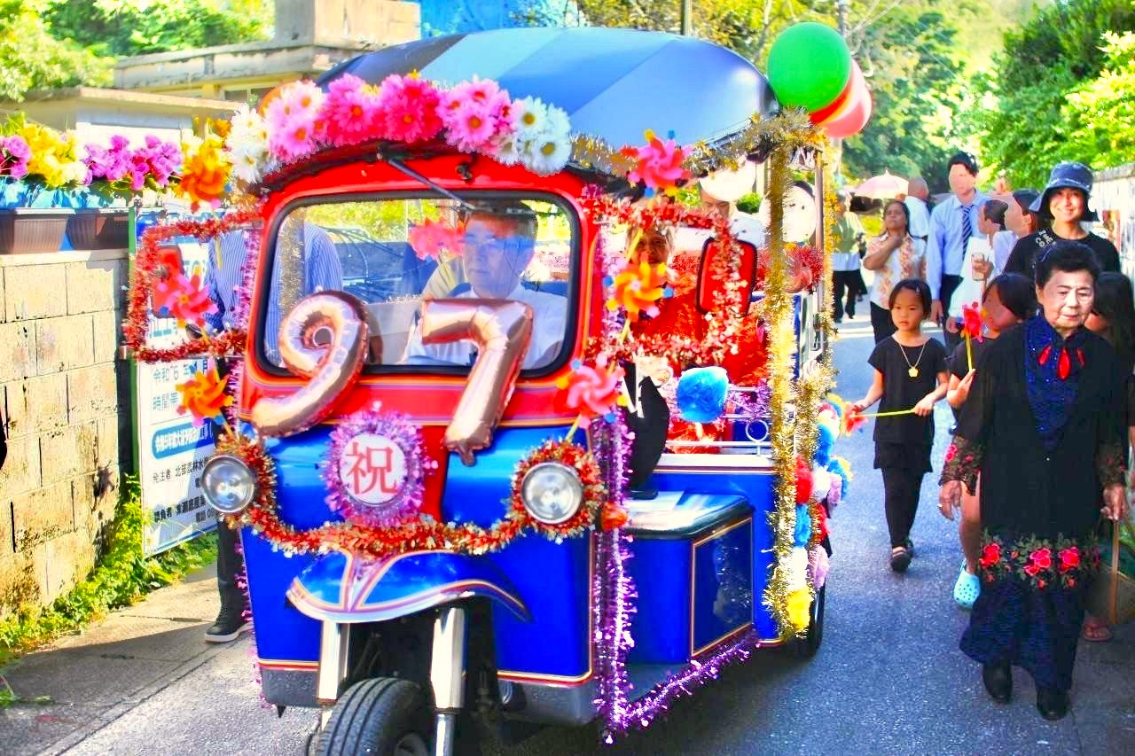 風車や風船など華やかに装飾されたトゥクトゥクで大切なおじぃ~おばぁ~のカジマヤー祝いを☆彡